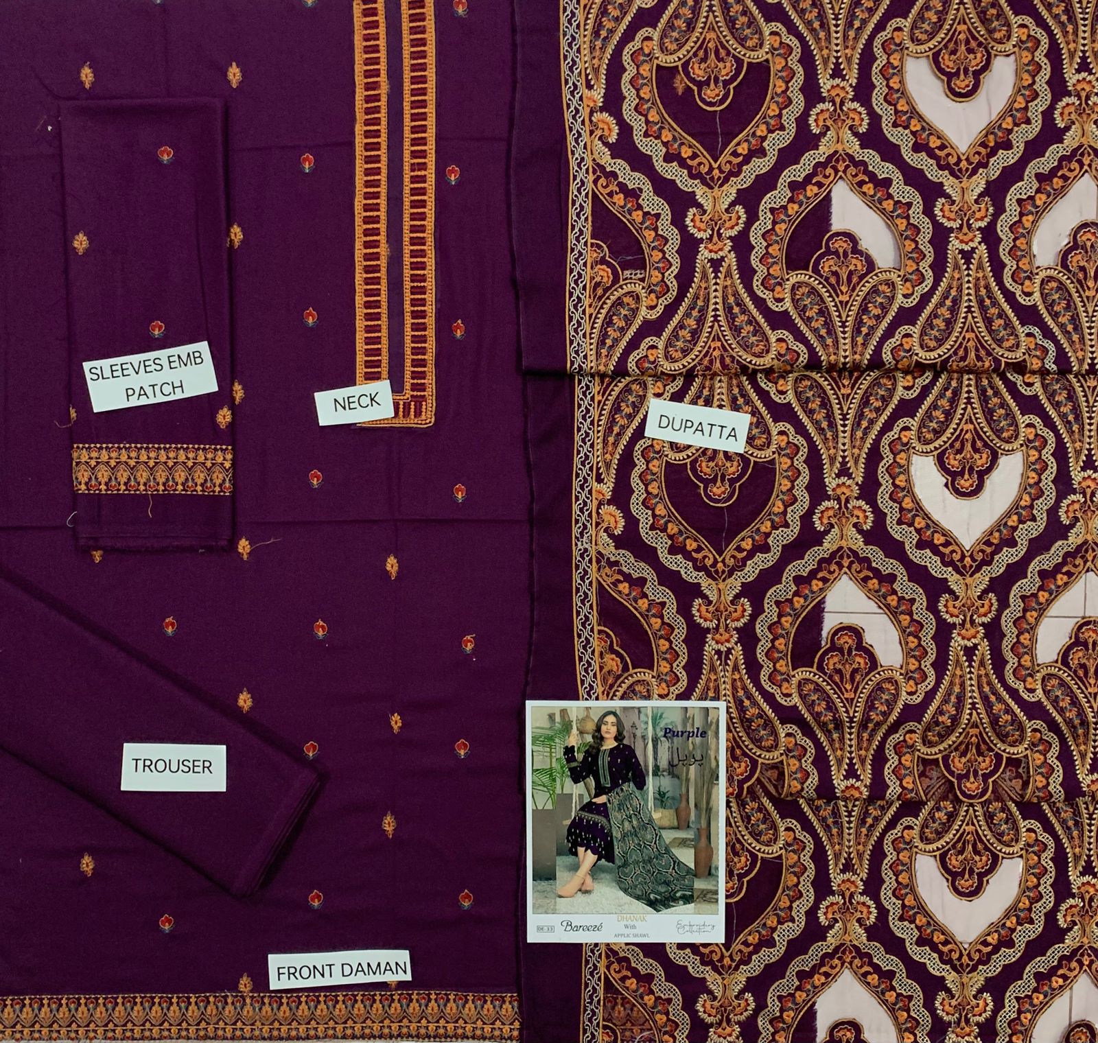 EMB 3Pc Dress With Luxury Laser Cut Work Embroidered Shawl - W701 Purple